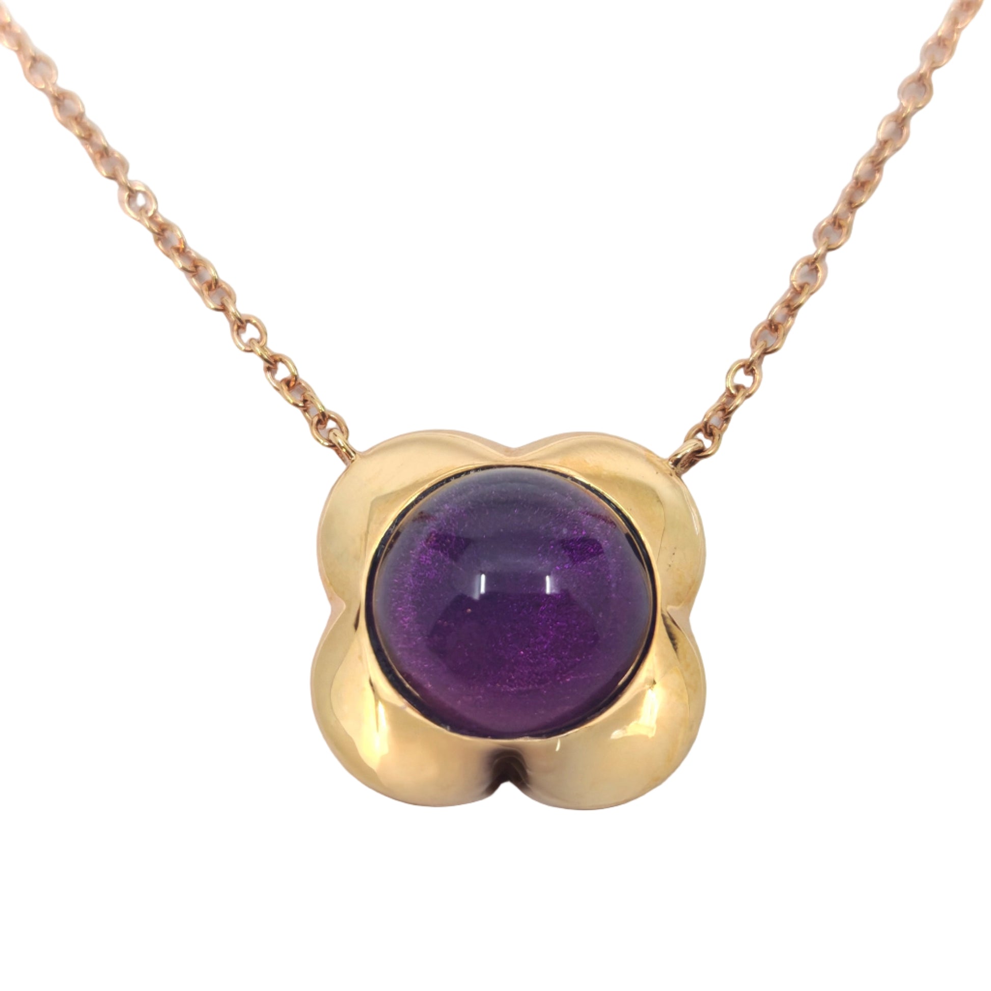 Moderni 18K (750) punakullasta valmistettu kaulakoru, jossa on kukan keskelle istutettu ametisti. Ketjun pituus on 42-45 cm.