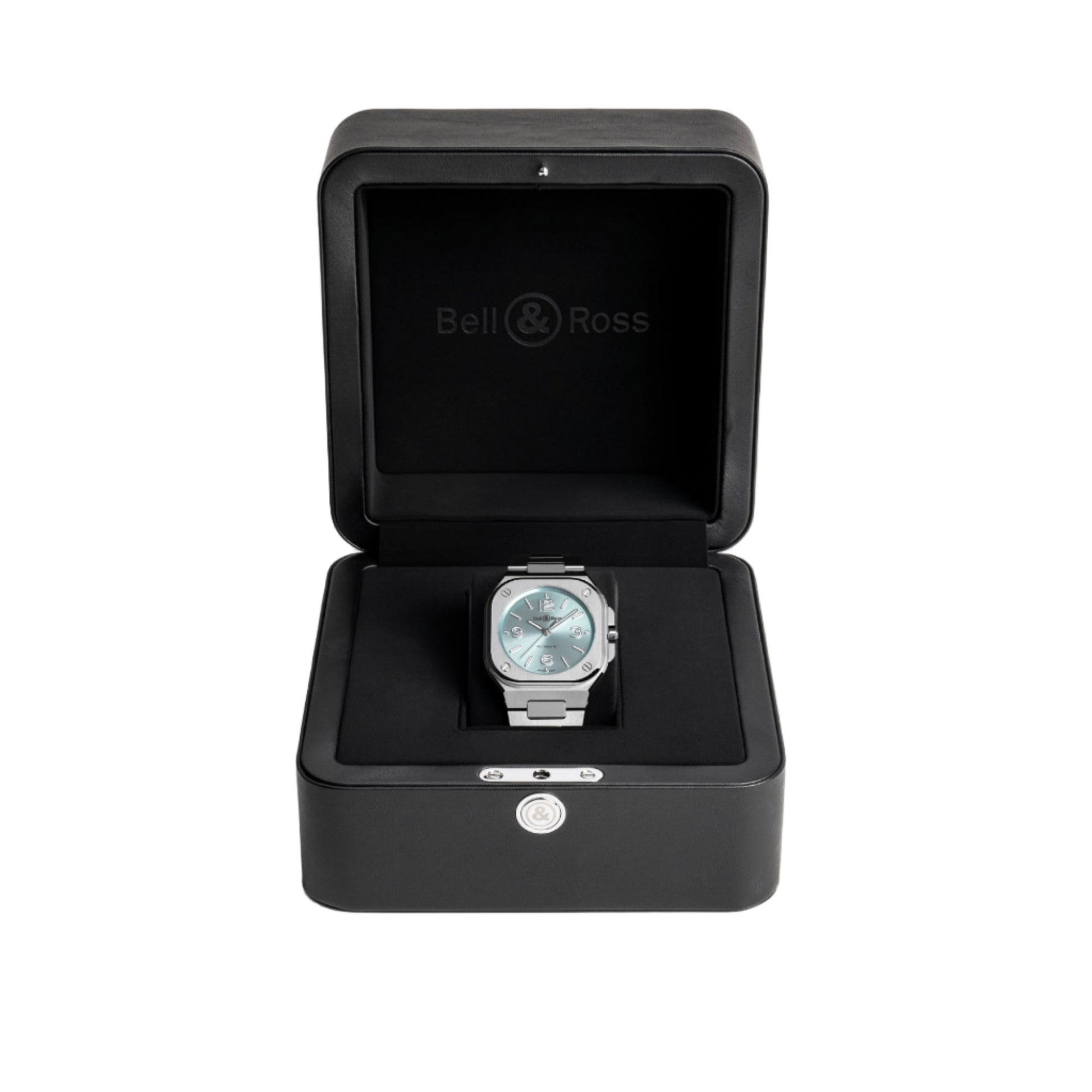 Bell & Ross BR05A-S-BU-ST/SST 36 mm -kellossa on upea, kiiltävä jäänsininen lakattu kellotaulu ja teräskuori, jossa kiillotetut ja satiiniviimeistellyt pinnat vuorottelevat ja ulottuvat harmonisesti sen huomattavan mukavaan teräsrannekkeeseen.