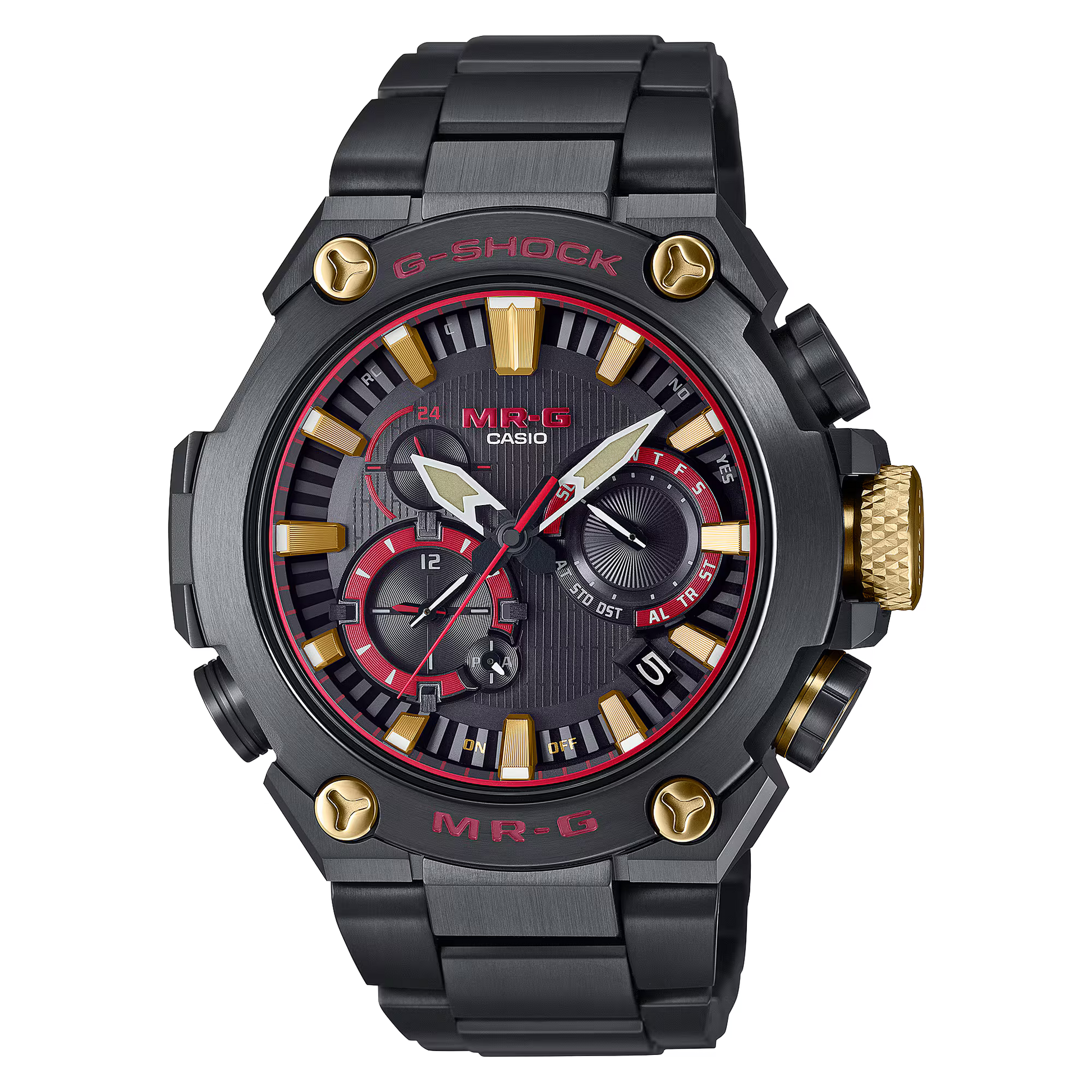 Kehässä komeilevat G-Shock ja MR-G -logot on upotettu tällä perinteisellä rohkeuden värillä ja sitä käytetään myös kellotaulun osissa. Kellossa on kerrostettu G-Shock -brändin punaisia ja mustia värejä, jotka heijastavat ainutlaatuista ja ajatonta voiman tunnetta.
