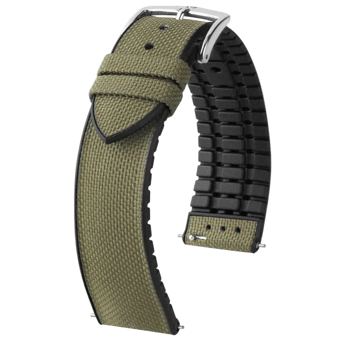 Merestä kerätystä PET-materiaalista ja mustasta raakakumista valmistettu, purjekankaan näköisenä Hirsch Arne ranneke on paitsi naarmuuntumaton ja vedenkestävä, myös 100% vegaani.