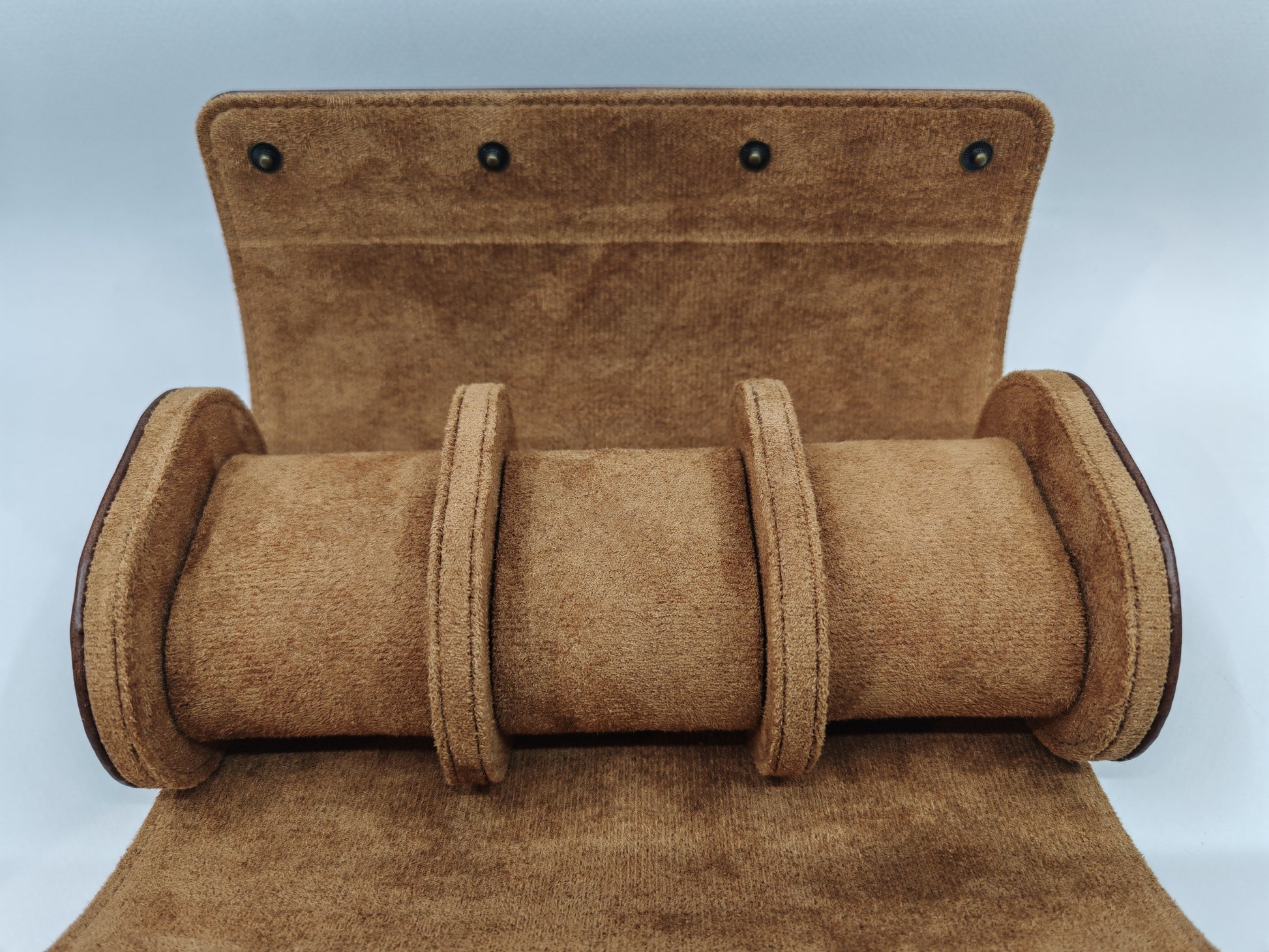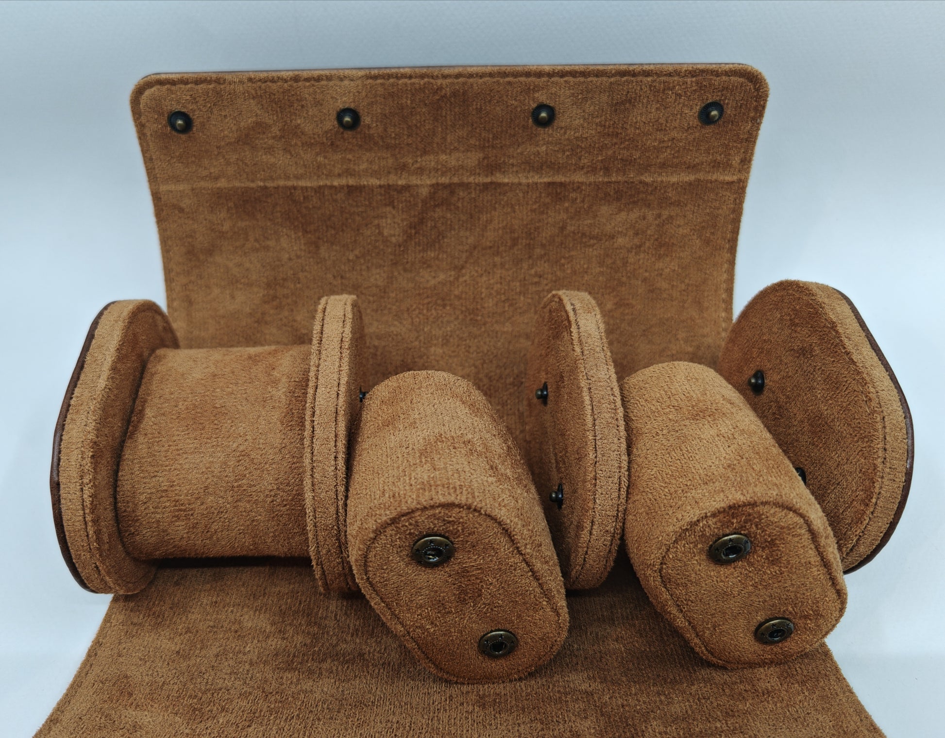 Sisäpuoli on vuorattu keinomokkanahalla arvokkaiden kellojen suojaamiseksi, matkalla ja kotona! Sisätyynyt ovat irrotettavissa ja kiinnitetään koteloon neppareilla.