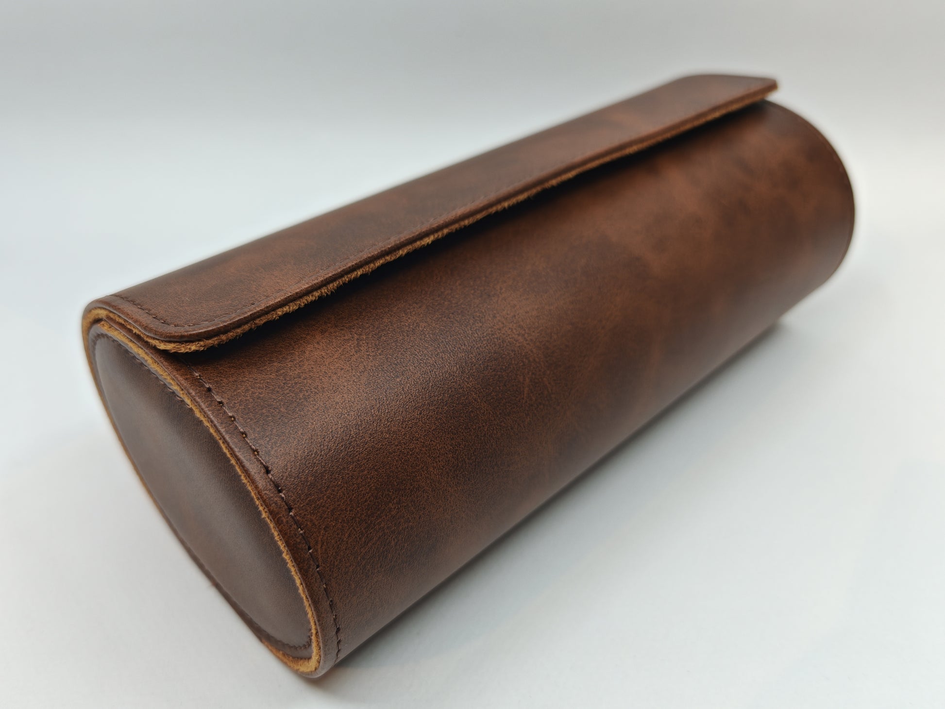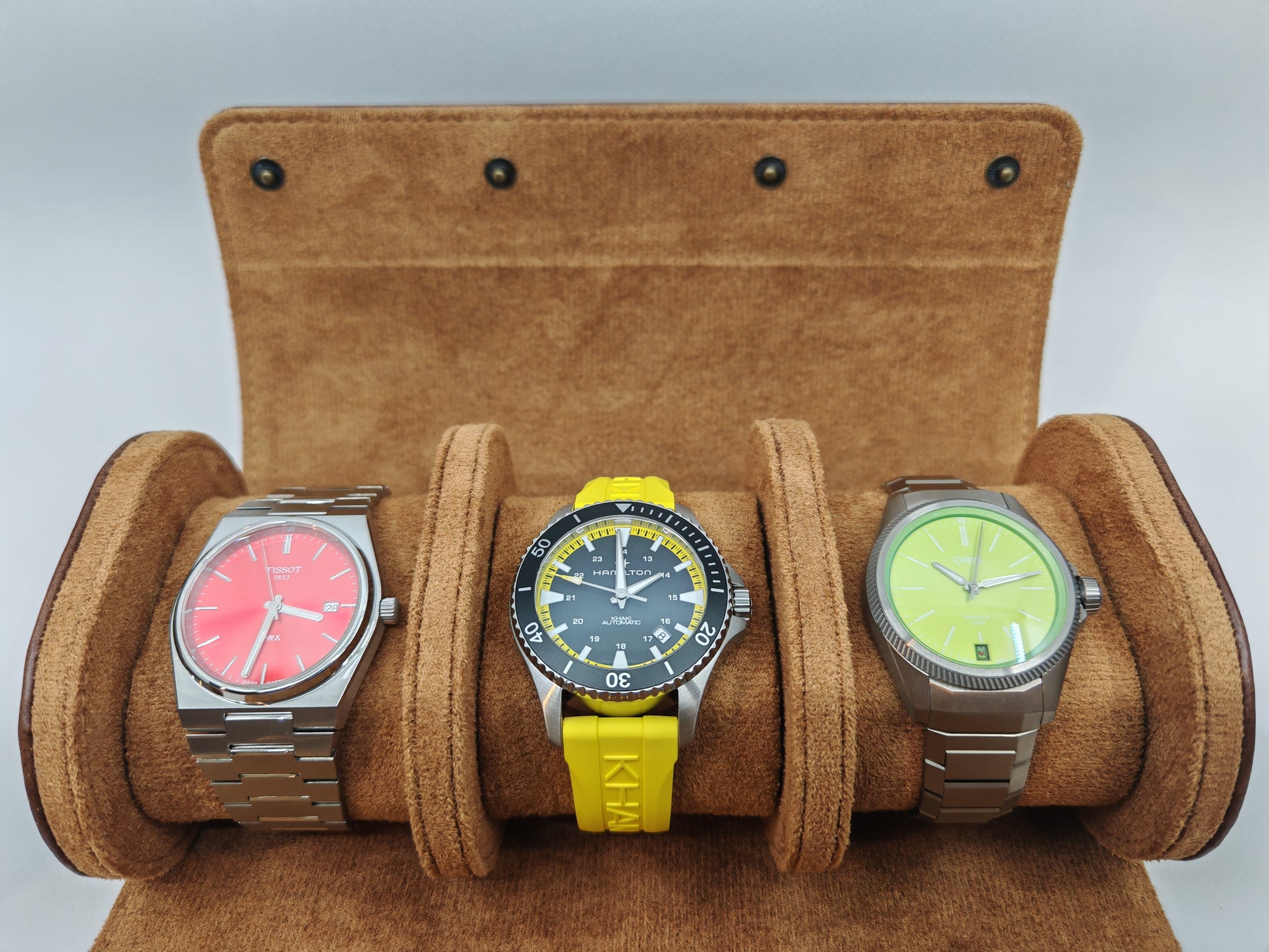 Tyylikäs ruskea keinonupukkinahasta valmistettu kotelo kolmelle kellolle.