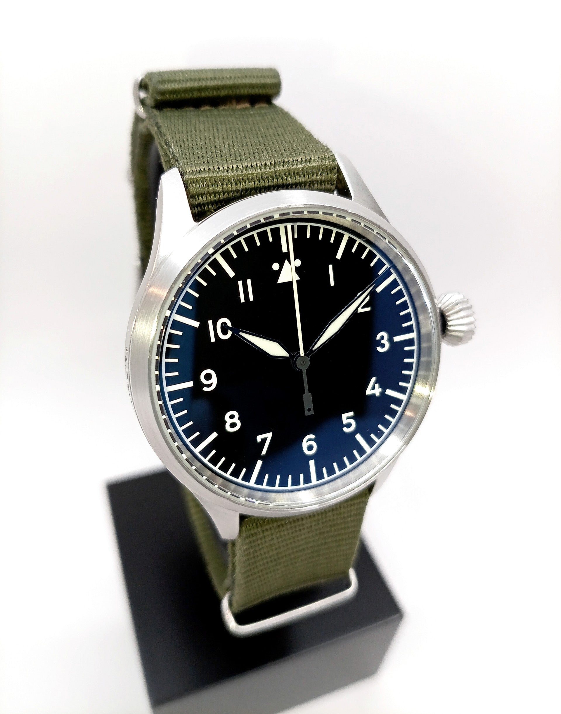 kuori: harjattu teräs 37mm, kyljessä historiallinen Saksan ilmavoimien pilottikellojen tunnusnumero, lasinen kierretakapohja, kierrenuppi