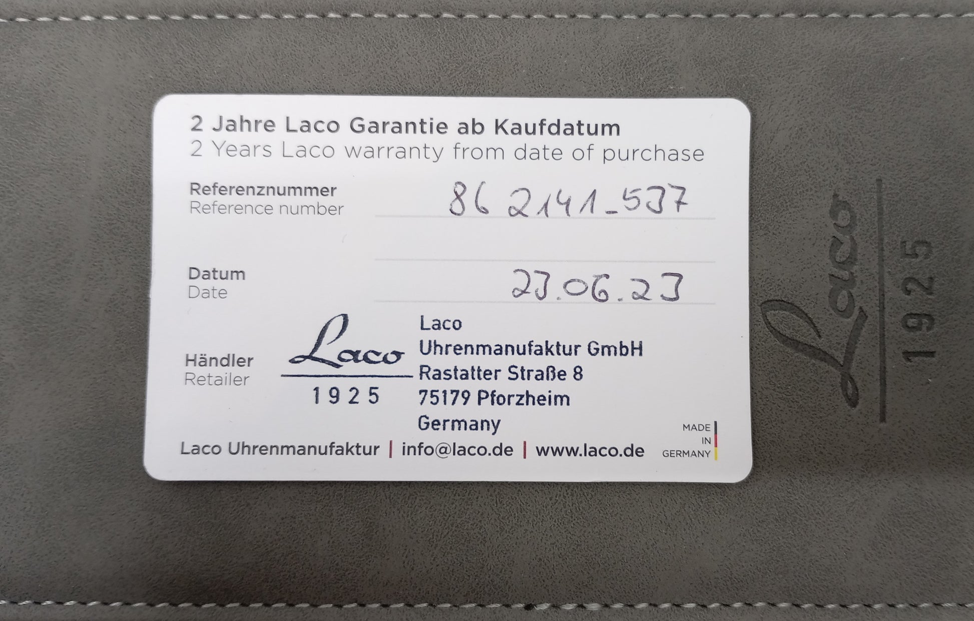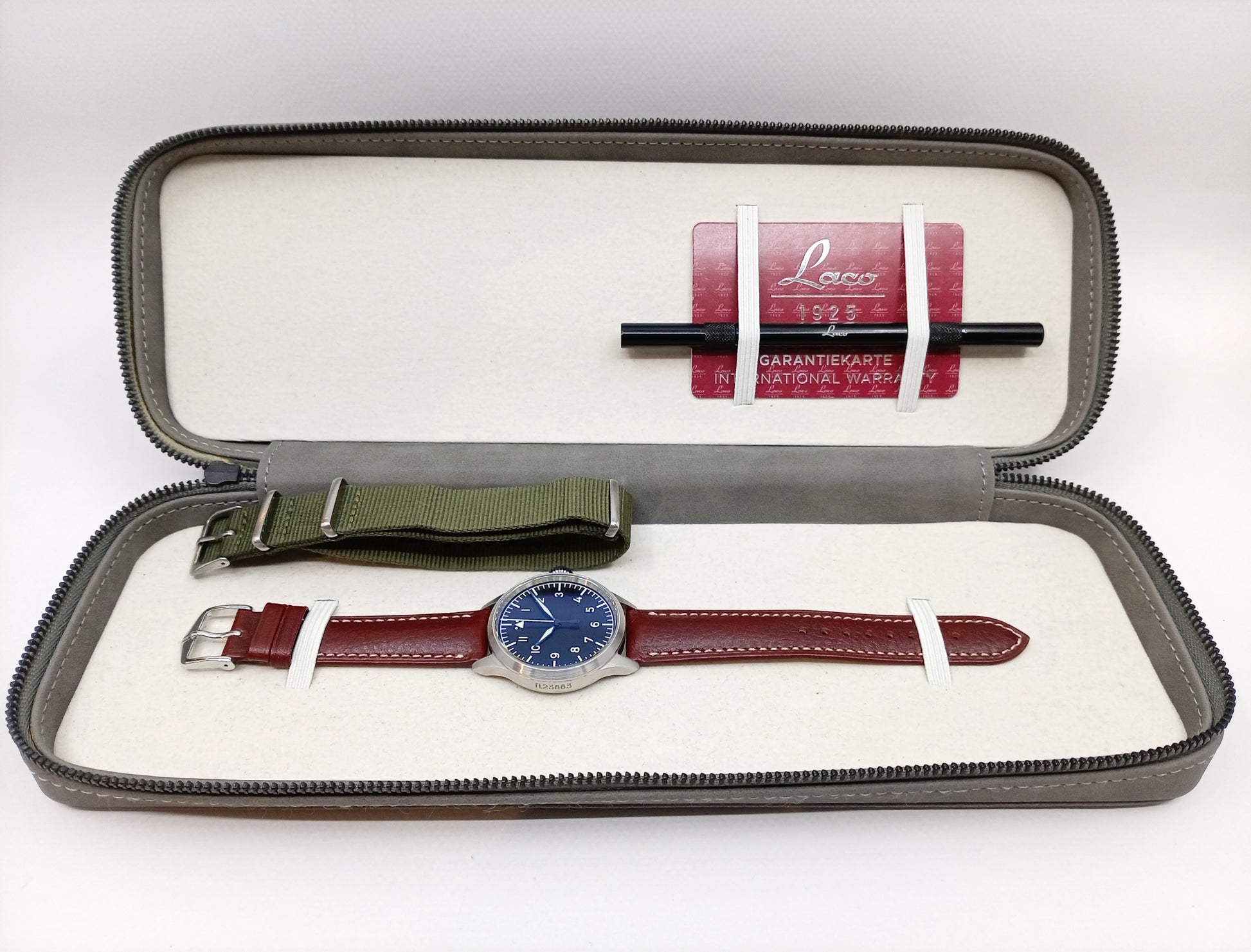 Saksalainen Laco (Lacher & Co) on valmistanut Pforzheimin kellokeskittymässä laadukkaita kelloja jo vuodesta 1925. Erityisen tunnettu Laco on pilottikelloistaan ja olikin yksi vain viidestä kellovalmistajasta, joka sai tehdä virallisia lentäjänkelloja Saksan ilmavoimille toisen maailmansodan aikana. Nyt myynnissä oleva Stuttgart Pro edustaa klassista pilottikellon muotoa ja funktionaalisuutta. Kohtuullinen koko ja selkeä taulu yhdistettynä hyvään vesitiiviyteen kierrenuppeineen tekee kellosta oikean toolwatchin. Tämä kappale on tilattu suoraan Lacolta ja siihen on valittu lisäominaisuuksina taulu ilman mitään tekstejä, hienommin viimeistelty koneisto ja lasinen takapohja (kellon hinta ollut uutena 1000 EUR). Mukaan tulee luonnollisesti alkuperäinen nahkakotelo, takuukortti ja rannekkeenvaihtotyökalu, jolla vaihdat käden käänteessä rymynaton klassiseen nahkarannekkeeseen tilanteen niin vaatiessa.