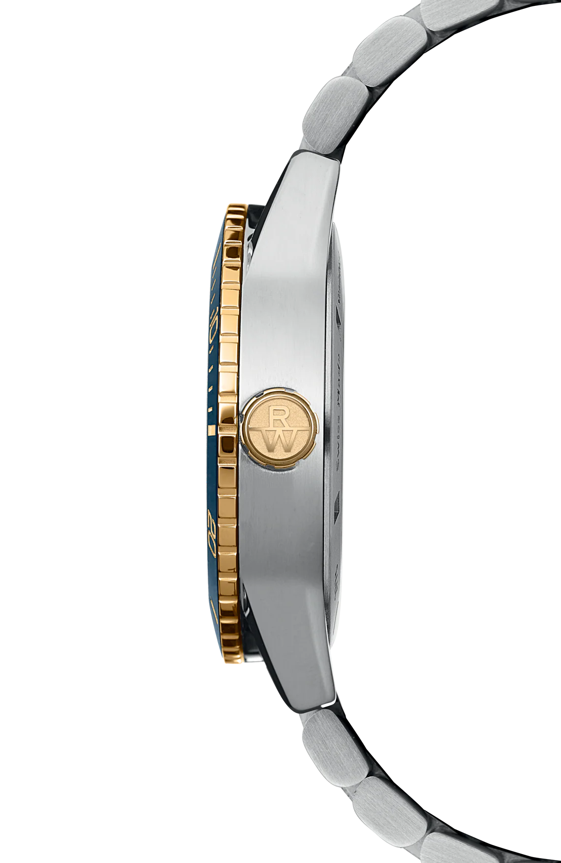 Merkin tunnusmerkillä RW-monogrammilla kohokuvioitu keltakullattu kierrelukittava nuppi antaa kellolle 300 metrin (30 BAR) vesitiiviyden.