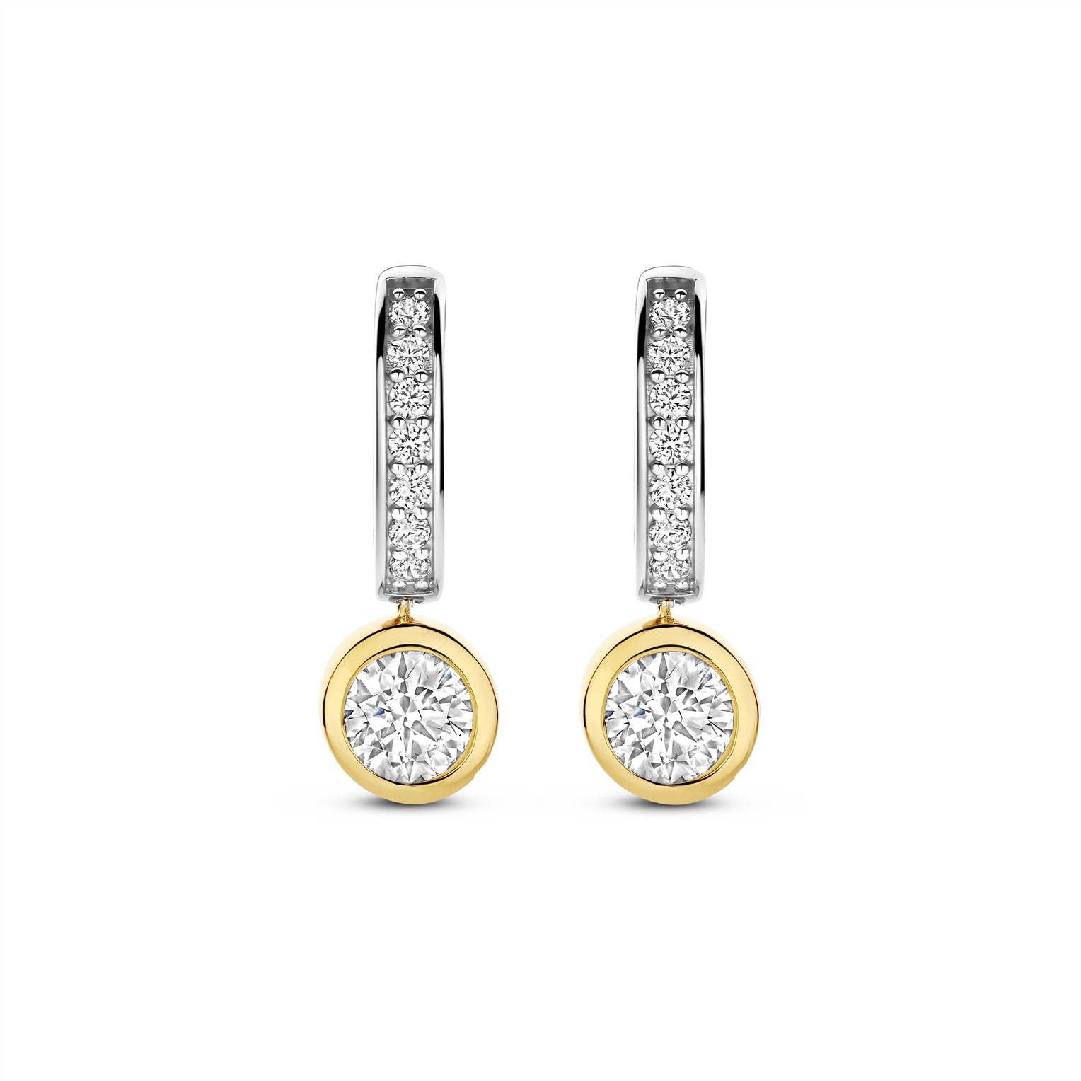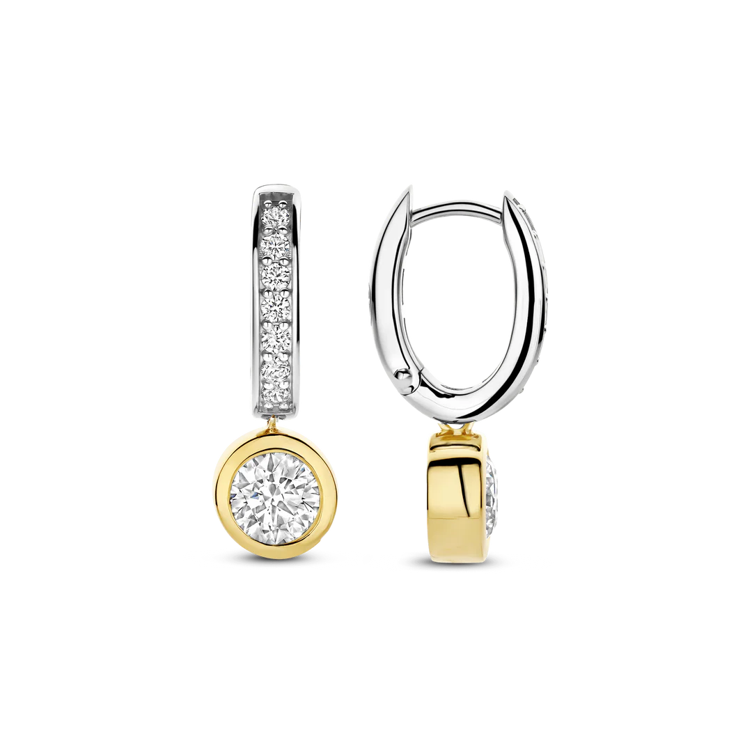 Nämä elegantit korvakorut on valmistettu 925 sterlinghopeasta, ja niissä on rivi pavé-istutettuja kirkkaita kuutiollisia zirkoniakiviä rodiumpäällysteisten renkaiden reunoilla, ja niiden lisäksi sileissä keltakullatuissa kehyksissä on briljanttihiottuja solitaire-kiviä.