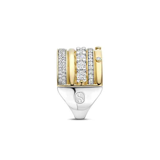 Uppoudu säkenöimään voimaan tällä kullatulla TI SENTO hopeasormuksella! Lämpimällä keltakullalla pinnoitettu, 925 sterlinghopeasta valmistettu leveärunkoinen sormus hurmaa viidellä veistoksellisella rivillä käsin istutettua kuutiollista zirkoniaa erilaisissa istutuksissa. Kaarevien muotojen, heijastusten ja kimalluksen vuorovaikutus antaa sille rikkaan, arkkitehtonisen tunnelman, ja kapeneva runko tekee siitä helpon käyttää.